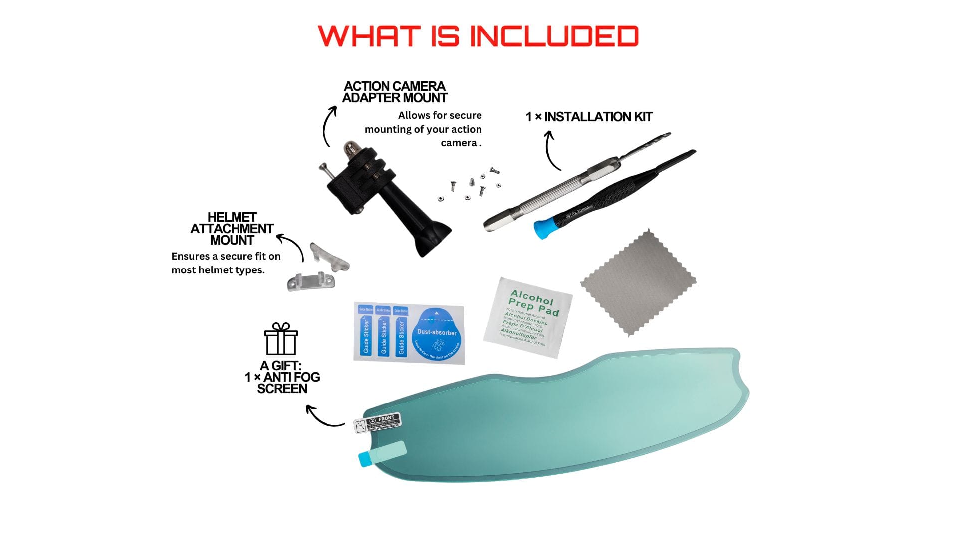 - 2 × installation kit which includes template, dedicated linear guide, manual – so you can use it on two different helmets